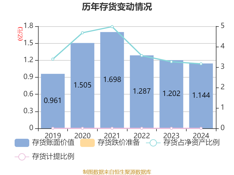 从存货变动来看,截至2024年末,公司存货账面价值为1.14亿元,占净资产的3.16%,较上年末减少583.37万元。公司本期没有计提存货跌价准备。