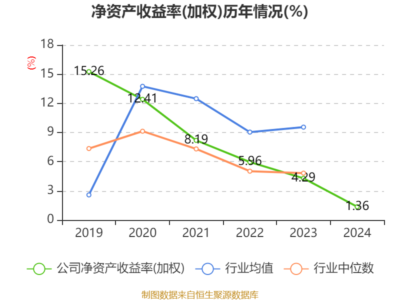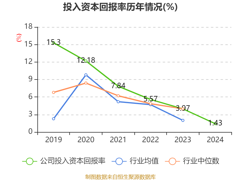 数据显示,2024年公司加权平均净资产收益率为1.36%,较上年同期下降2.93个百分点。公司2024年投入资本回报率为1.43%,较上年同期下降2.54个百分点。
