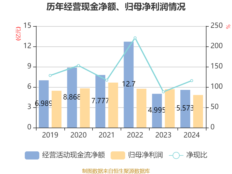截至2024年,公司经营活动现金流净额为5.57亿元,同比增长11.57%;筹资活动现金流净额-3.84亿元,同比增加3227.51万元;投资活动现金流净额-4.62亿元,上年同期为-2.94亿元。