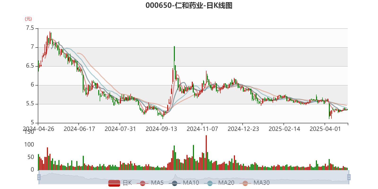 中证智能财讯仁和药业(000650)4月26日披露2024年年度报告。2024年,公司实现营业总收入40.75亿元,同比下降19.02%;归母净利润4.82亿元,同比下降15.05%;扣非净利润3.35亿元,同比下降24.73%;经营活动产生的现金流量净额为5.57亿元,同比增长11.57%;报告期内,仁和药业基本每股收益为0.35元,加权平均净资产收益率为7.90%。公司2024年度分配预案为:拟向全体股东每10股派现1.5元(含税)。